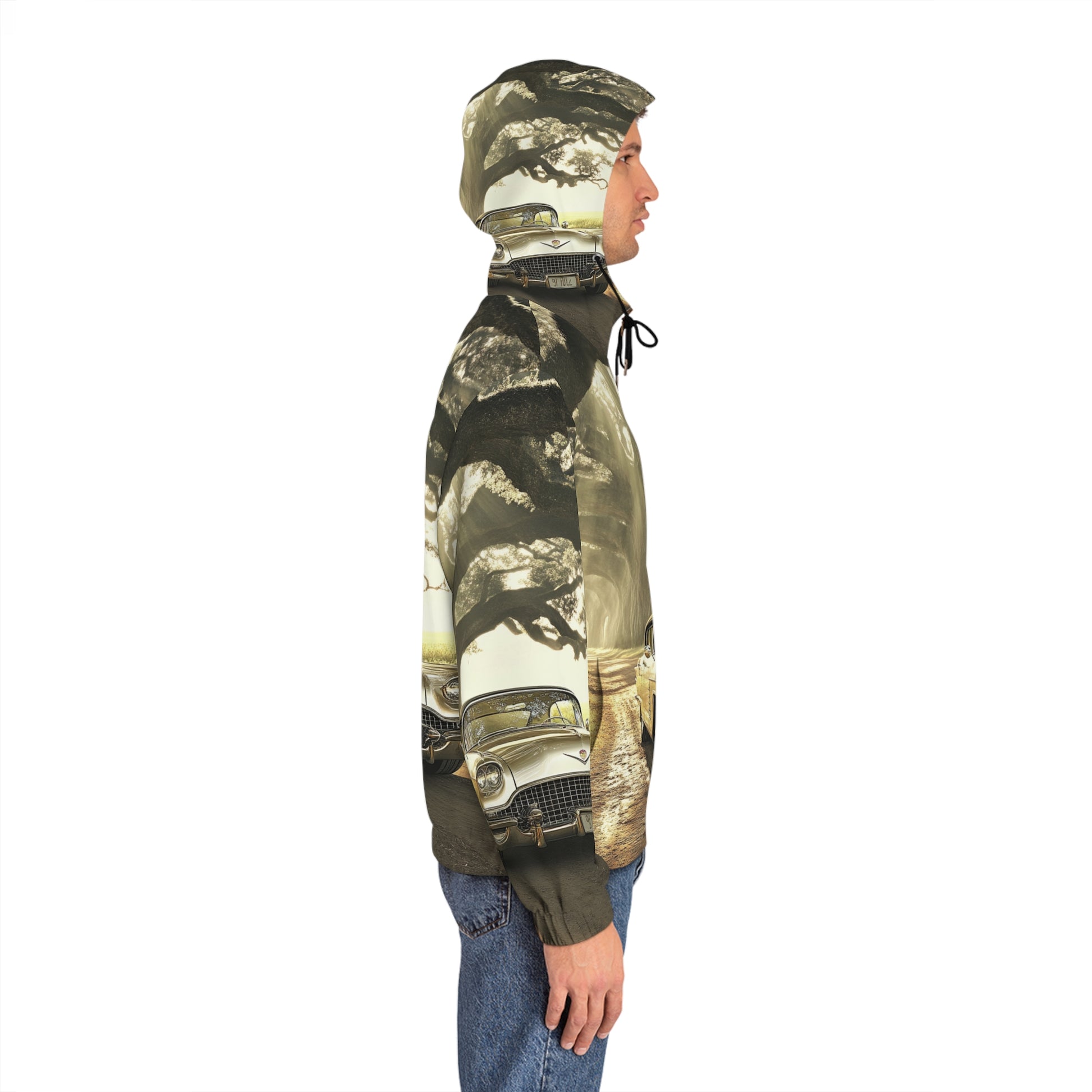 Drive into a golden-hour memory. This full-zip hoodie wraps a vintage car and sprawling oak in soft, stretch-infused fabric so the scene moves with you—sun-washed chrome, dappled shade, and a long quiet road. Wear it on morning runs through tree-lined streets, on weekend drives when the world slows, or while tinkering in the garage with friends. The metal zipper and drawstring details add a tactile, classic touch while the two slanted pockets keep small tools or warm hands within reach. It feels like a road trip snapshot turned wearable: familiar, calm, and quietly adventurous.